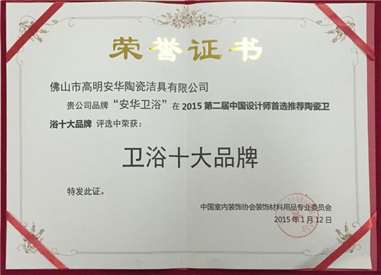 活动当天,主办单位还为一批优秀企业以及设计师颁奖。作为卫浴行业领军品牌的安华卫浴,凭借雄厚的企业实力以及品牌影响力,一举获得“2015年中国陶瓷卫浴行业卫浴十大品牌”。