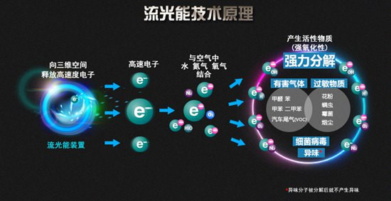 此款机型采用6重强力的分解去除构造,强力吸入污浊空气,高效虑解、分解空气中的多种有害物质。每层滤网各司其职,能够让通过它的有害物质无处藏身。 流光能是一种能在三维空间内产生大量高速电子的等离子放电技术。与普通的放电技术相比,流光能的放电技术范围广、持久性强,生成的高速电子更容易与空气中的氧、氮分子结合,产生强大的氧化分解能力,迅速分解多种有害物质。