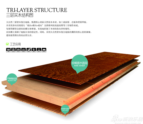第四,结构 消费者在选购地板时,通过多层实木地板的四边榫口,可以看到单板层层叠加的结构。传统多层实木地板基材都采用奇数层组坯,一般为七层或九层。近几年,一些品牌对传统工艺进行改良,采用偶数层组坯方式,即为八层或十层。消费者在购买时不妨将地板拿起,看一下地板的结构层,数一下是几层的。 第五,种类 实木复合地板有两种,一种为三层实木复合地板,它的产生较早,是由表板、芯板、背板三层木板拼合而成。另一种多层实木复合地板则由11层或9层组成,稳定性要比三层实木地板好些。尤其是在地热环境中,多层实木地板耐热性强,更不易变形。因此在购买时要根据自身需要,搞清究竟买三层还是多层实木复合地板。如果你选的是地热用地板,那就建议选择多层的。 第六,拼接 拿到地板时,可以在一个包装箱中随手取5块以上地板置于玻璃台面上或平整的地面上,进行拼装。拼装后用手拍紧榫槽,观察榫槽结合是否严密,然后用手摸,感觉是否平整。手摸后,再拿起两块拼装的多层实木复合地板在手中晃,看其是否有松动,若有高低较突出的手感现象和松动现象,说明该产品不合格。 大自然实木复合地板从诞生之日起就一直受到市场的青睐,市场占有率不断攀升。由多层平面的低调到私享自由拼的个性,从美学仿古的张扬到康德美学1号的严谨,从三层实木的稳定到NATURE1530的奢华,再到御宅拼花、墙体艺术板的格调与独特——大自然实木复合地板家族7大系列华丽衍变,期间却浑然天成,以科学与艺术的名义,坚守最原始的自然。随着木材的稀缺,维护生态、节材环保理念的深入,使实木复合这一品类越发受到消费者的追捧;再加之地暖铺装的流行、普及,其更将渐趋成为木地板品类中的主流。