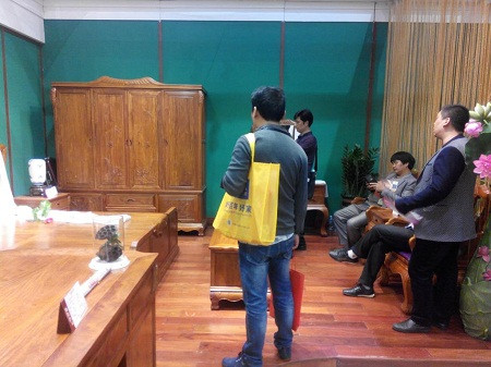观展者了解、咨询产品情况 “轩红坊”O2O线下展示区引领潮流 今年,太兴家具新推出的“轩红坊”O2O线下展示区也在东莞展精彩亮相!太兴家具的“O2O”新型销售模式,很好的迎合新的消费群体的消费习惯。 红木家具企业推出“O2O”交易平台,在业内还属首次。因此,许多观展者都对太兴家具的这一新的营销模式产生了极大的兴趣,认真询问、了解其具体操控流程,并有不少观展者表示希望加盟合作。