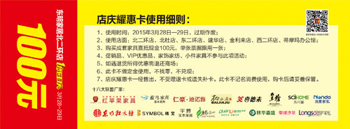 即日起—3月27日在东明家居省会各大卖场交纳订金,活动期间补交全款,单店累计消费每满千元的顾客,均可获赠20元家电建材或家饰窗帘代金券一张,单张消费票据最多可获赠3张代金券。代金券在北二环店庆活动期间,东明省会任一卖场,购买家电建材或家饰家纺直抵现金使用。