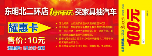 3. 持卡均可参加3月29日11:00在东明家居北二环店举办的无购物抽奖活动。