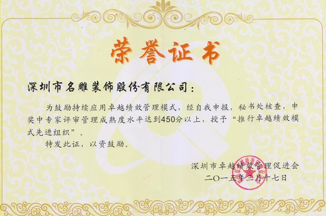 名雕装饰作为全国住宅装饰行业的领军企业,自导入卓越绩效模式以来,在董事会的高度重视和带领下,在深卓会的指导和监督下,积极推行、持续应用卓越绩效模式,成熟度水平急速提升。2013年,公司成为深圳地区家装行业唯一获得“区长质量奖”的试点企业,并于2014年经上级单位、领导及专业评审小组的推荐,入选了深圳市“市长质量奖”的现场评审。
