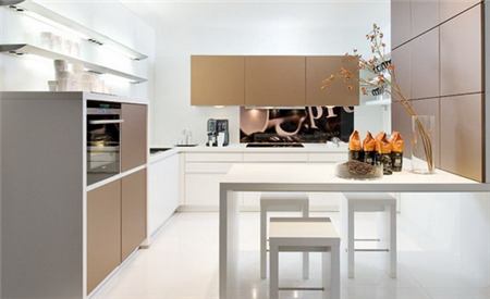 在小小的空间里,很好的将整个厨房的容纳性发挥到极致,现代的家具设计,整个给人耳目一新的感觉。