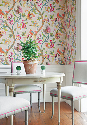 这款巴莎系列倡导热烈多彩且轻松愉悦的居家环境。肉眼可见13色以上的色彩在同一画面清晰展示;热烈绽放的孔雀屏花,成对出入的彩色翼鸟,妖娆五彩的花簇,正是追求自由人士的理想美式居家方式,也非常迎合色彩斑斓的春天。