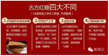 女人花古方红糖的蔗香味浓郁,口感细滑,甜度为现行蔗糖的1.5倍,具有补血益气、美容养颜、缓解痛经、健脾暖胃、驱风散寒之功效。中医认为,红糖性温、味甘、入脾,具有益气补血、健脾暖胃、缓中止痛、活血化淤的作用。红糖的好处在于“温而补之,温而通之,温而散之”,也就是我们俗称的温补。(微信号:68822233)