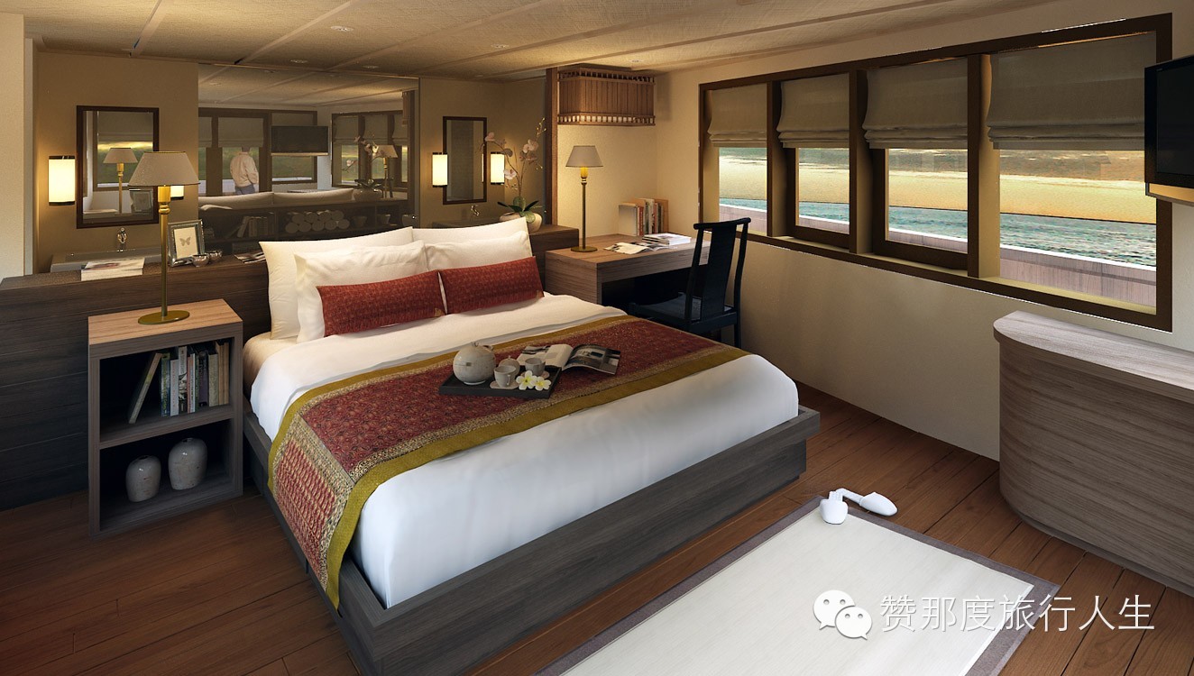 船上有4个设备齐全的客舱,配有空调、大床、独立卫生间、书桌以及两个大衣橱。豪华套房被设计得很宽敞,透过大窗户可看到270°的醉人景致,饱览变化万千的美景。帆船上还有图书馆、酒吧、可容纳12人的餐厅以及大量可以尽情赏美景的户外空间,你还可以再船上或是附近的沙滩上享受阿丽拉特色按摩理疗。