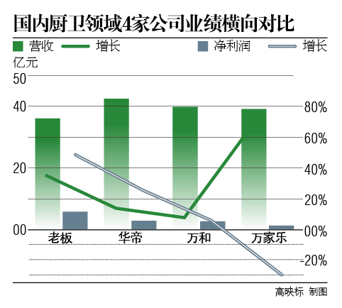 以浙江老板电器为例,去年营收达到35.89亿元,同比增长35.24%,净利润同比上升48.95%至5.74亿元,成为厨卫行业的盈利冠军。在家电企业纷纷涉足多元化的大环境下,老板电器始终专注于油烟机这一主业,坚持将高端化和差异化做深做透。老板电器的目标是要到2016年再造一个新“老板”。老板电器董事副总裁赵继宏日前曾对外表示,公司快速增长的关键在于坚定地走上品牌高端化、产品差异化和渠道多元化的道路。