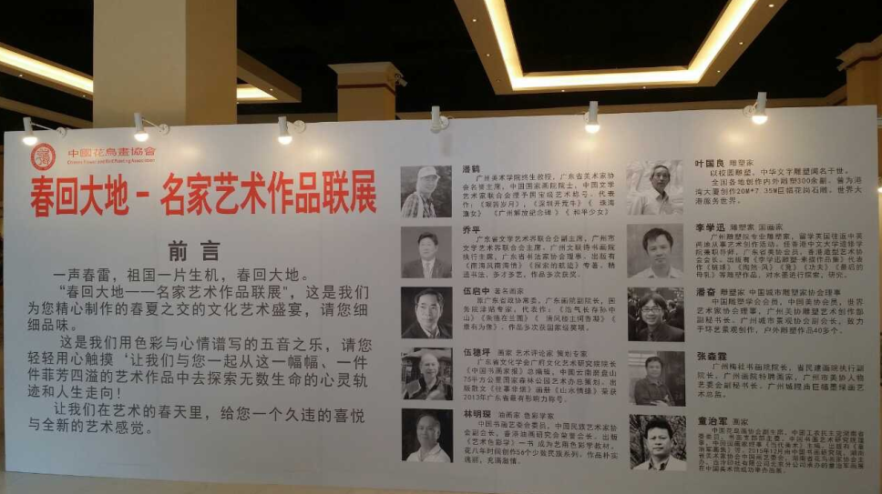 画展现场剪彩仪式 2015年4月29日-5月5日,由中国花鸟画协会、广东省文化学会广府文化艺术研究院、广州橘子洲画社联合主办的“春回大地”艺术名家作品展在广州展出。 参加此次展出的书画艺术名家有广州美术学院终身教授、广东省美术家协会名誉主席、中国国家画院院士潘鹤,广东省文联副主席乔平,广东画院副院长伍启中,广东省文化学会广府文化研究院院长、《中国书画家报》总编辑伍穗坪,中国书画艺委会委员、中国民族艺术家协会副会长林明琛,雕塑家叶国良,广州雕塑院专业雕塑家李学迅,雕塑家、中国城市雕塑家协会理事潘奋,广州梅壮书画院院长、广州画院特聘画家张森霖和湖南长沙花鸟画协会主席、画家童治军。 据了解,参加“春回大地”艺术名家作品展的十位画家,有九位画家来自广东,仅有画家童治军来自湖南。童治军,字金曦,笔名霜毫,尚艺斋主人。中国农工民主党湖南省委委员.书画支部主委。长沙市文联常务委员,长沙市花鸟画家协会主席。中国书画艺术研究院理事,中国国画家协会理事,湖南省花鸟画家协会理事,湖南省美术家协会会员,长沙市古沩书画院院长,《当代美术》主编。出版有《童治军画集》花鸟集、松树集。2005年12月,他在中国美术馆成功举办花鸟个人展,受到业界权威的高度认可。其作品被多个博物馆、美术馆、画廊及东南亚地区的收藏爱好者收藏。 在生活中,童治军为人随和、真诚,圈内圈外都好友如云,对他的为人和艺术大家都交口称赞。他有很多学生,来自各行各业,有为官的、经商的、种田的、下岗的。童治军表示要将花鸟协会打造成温馨、和谐、奋进的“花鸟画艺术家之家”,创建花鸟画艺术人才成长的良好环境;丰富艺术内涵,创新活动形式,不断发展花鸟画艺术的氛围。
