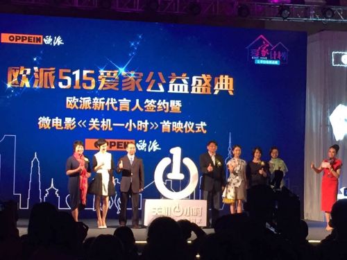 2015年5月15日,第22个国际家庭日,欧派515爱家公益盛典在上海浦东文华东方酒店隆重举行。在这场为公益鼓与呼的盛典中,孙俪、周冬雨、李行亮等明星齐聚一堂,与欧派家居集团共同发出“为爱关机一小时”的倡议,呼吁社会关注家庭健康问题,用心陪伴家人。在盛典上,孙俪正式签约欧派家居集团,成为欧派新任品牌形象代言人和爱家大使。同时,由欧派斥资拍摄、90后人气明星周冬雨主演的公益微电影《关机一小时》也在盛典上举行了首映礼。