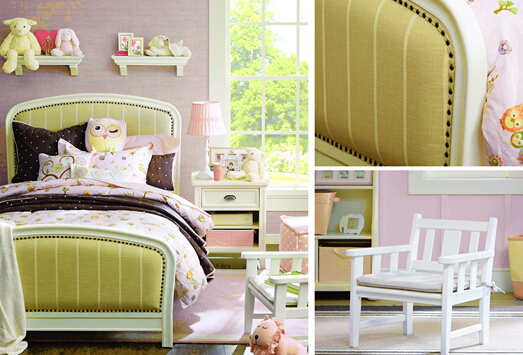 恬静的粉色,既带着唯美娇嫩的公主情结,也可以充满活泼俏皮的萌动感,这一切皆由极富想象力的搭配而定。新推出的Megan儿童床,是Harbor House唯一一款软包儿童床。美国赤杨木主材厚重,圆角弧度与布艺床头增加了孩子活动时的安全度。奶白色与浅巧克力色调和出纯真甜蜜,搭配夜莺的床品与咖啡色的盖被,一如森林梦境。  为给孩子与家长创造一个无忧环境,Harbor House严格执行安全环保标准,使用安全环保漆,边角均进行倒圆处理,以防磕伤;床品均采用优质全棉面料,贴合儿童娇嫩的肌肤。