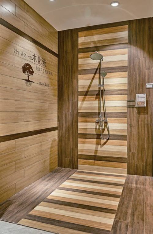 这种叫木化瓷的瓷砖,交错真木颜色让人不敢相信这是浴室