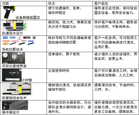 l双电机涡轮吸水马达提供足够吸力,一次性将清洗污水回收; l刷头防水设计,有效避免水滴顺轨道流入自动扶梯; l有不同型号刷头可适配不同品牌型号的自动扶梯;