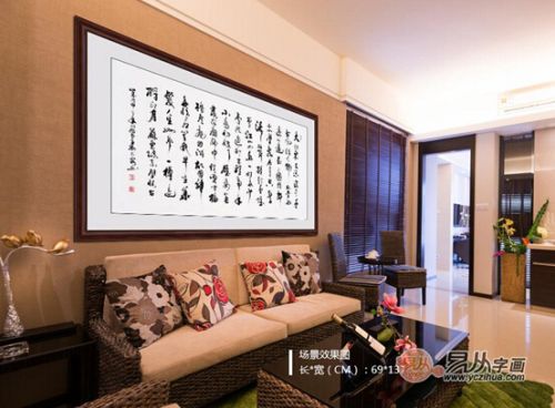 国宾礼书法家观山四尺横幅行书作品《海纳百川》(作品来源:易从字画商城) 三、书卷之气,改善运势,调节家庭风水 人们历来注重书法的风水功能,其中“气”是风水学的核心概念之一,“风水之气”指的是气的流动、气脉,就是气场。大家一致认为,名家书法充满着浓厚的书卷之气,不仅气场强,而且具有引发人向上、静心安神的功能。所以我们无论是装饰书法还是收藏书法,当讲求正大之气、雅正之气,或曰金石之气,书卷之气。 书法在风水上最常见用处是挡“门煞”,例如大门正对着卧室,在堪舆学上房被门正对着有不利之说,因为大门开闭所形成的急速气流会直“冲”入房,遇上这种情况就可以在房门上挂名家墨宝。这样不仅可以调节家庭风水,亦有招财进宝之功用。