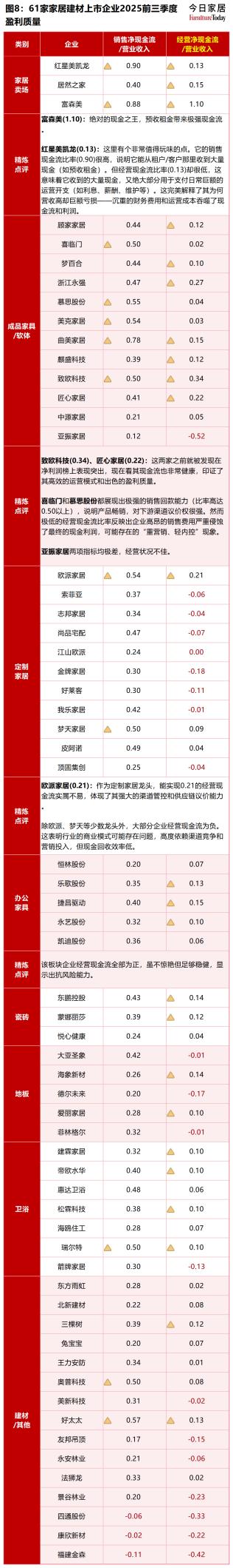 上图分板块对61家企业的现金流情况进行了整理并简单说明,重点关注定制家居板块。在11家定制家居企业中,经营现金流为负的企业高达8家,这些企业不仅没有创造现金,反而在消耗现金。