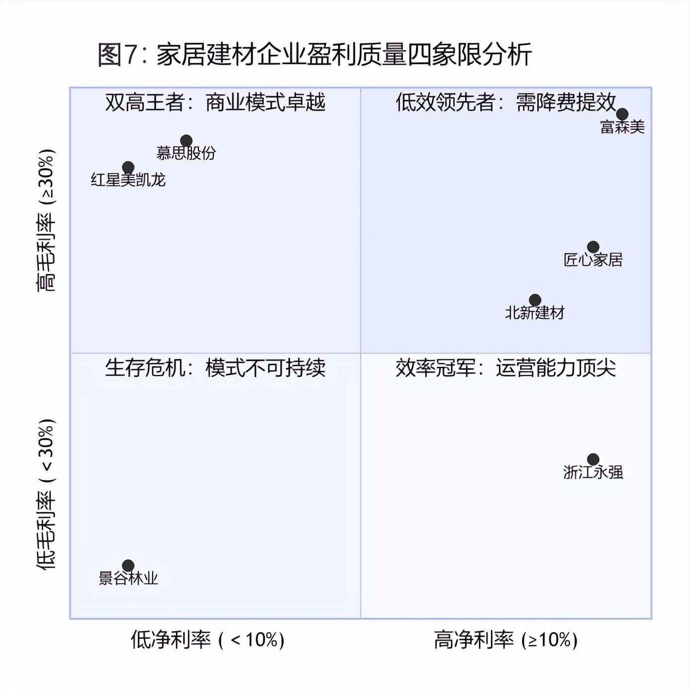 第一象限高毛利&高净利:代表企业富森美(毛利率65.36%、净利率52.72%)、匠心家居(毛利率38.36%、净利率26.18%)、北新建材(毛利率29.53%、净利率13.34%),这些企业通过产品及模式优势获取高额毛利,同时其顶尖的运营效率最大限度的转化了企业的最终利润。