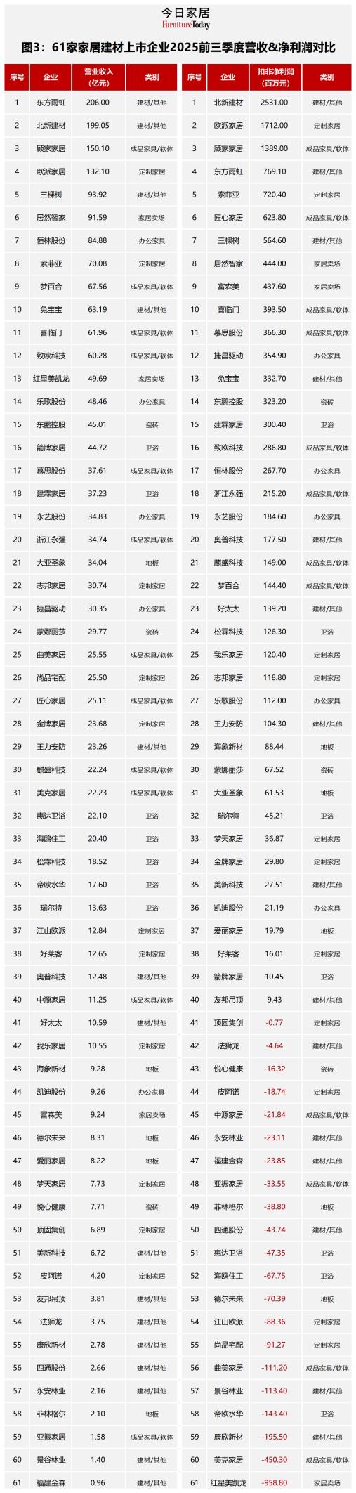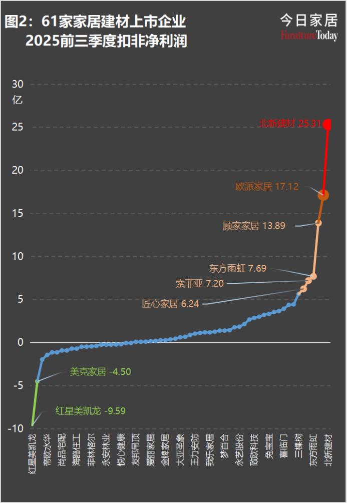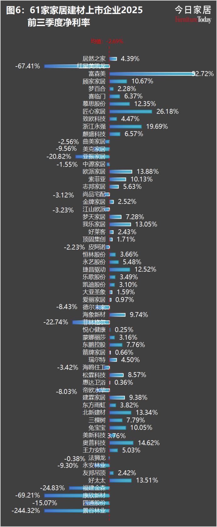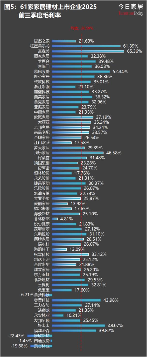 61家家居建材上市企业平均净利率为-2.69%,企业从实现26.59%的毛利率到净利亏损,背后是惨烈的价格战、高企的运营费用、沉重的财务成本和资产减值。