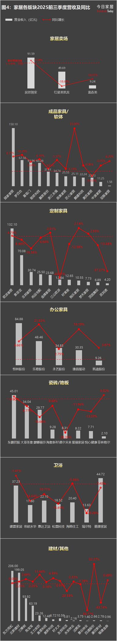 2025年前三季度,家居行业面临严峻挑战,61家上市公司营收平均下滑-5.45%。成品家具/软体板块最稳健,匠心家居以35.80%的增速领跑全行业,顾家家居(8.77%)、梦百合(10.29%)等头部企业均保持稳健增长。办公家具板块整体表现优异,乐歌股份(21.92%)、捷昌驱动(18.19%)凭借产品创新实现快速增长。