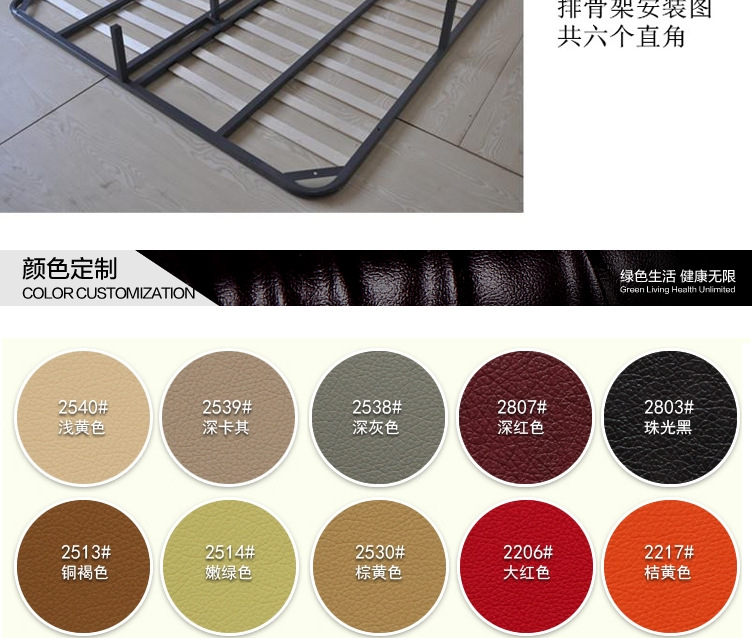 1.床头接触面采用头层黄牛皮,床边为PU皮。也可根椐客户客户需求用布艺、环保皮、