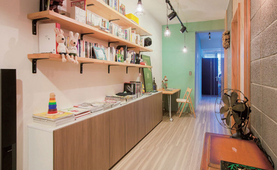 在细长型的格局中,廊道是避不掉的存在,但是廊道可以被赋予新的机能,考量到屋主的工作性质,设计师干脆把廊道翻转,安置大片书架与工作区块。